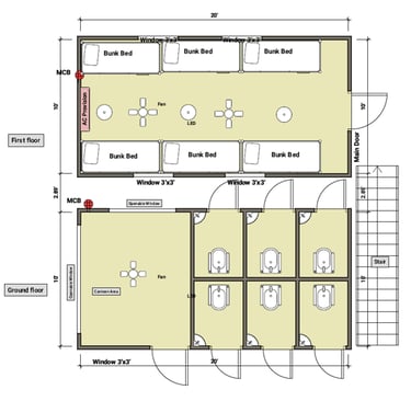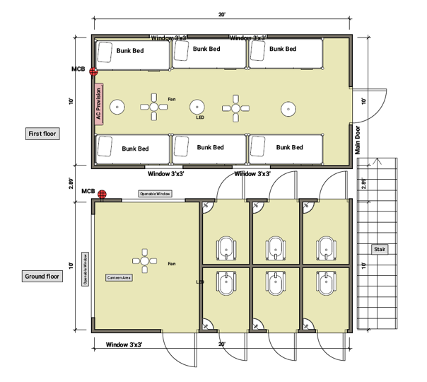Factory-built porta cabin dormitory units using standard modular sizes, insulation, structural framing, stair access, sleeping layouts, plumbing-ready wet areas and electrical integration.